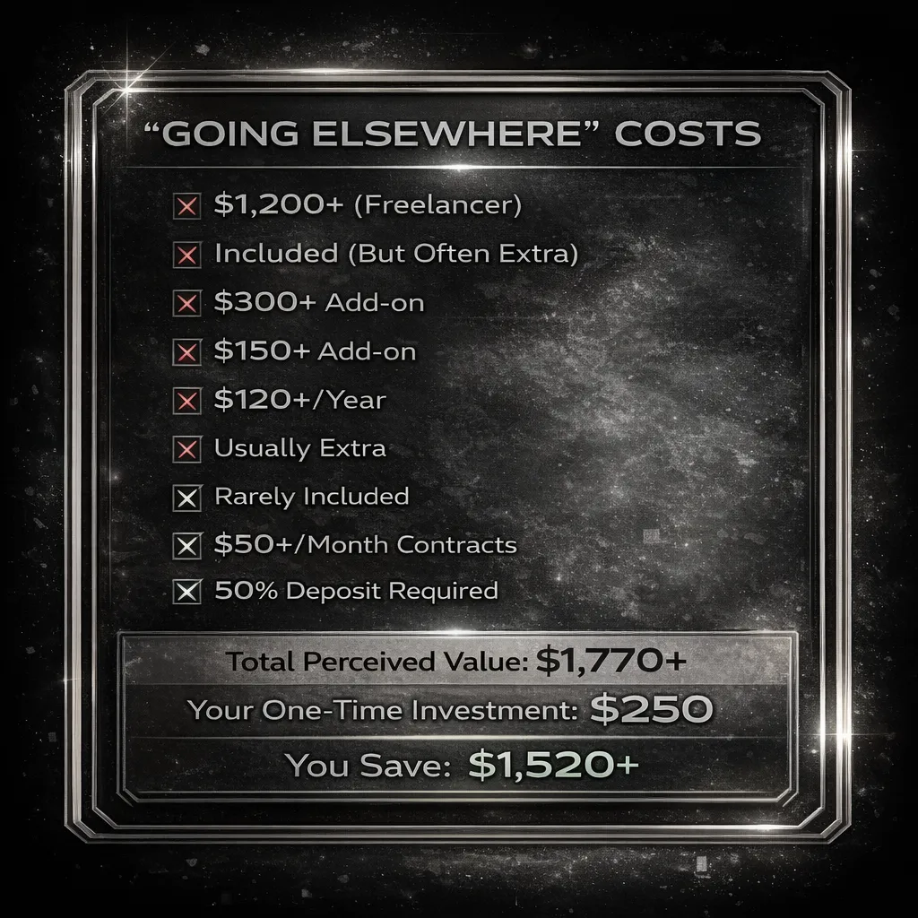 "Do the math: $50/month equals $600/year. For two years, that's $1,200 - nearly five times this one-time offer. And you still have to build it yourself, maintain it, and explain why it looks 'cheap' to potential customers. You're a business owner, not a web designer. Stop paying the 'I don't know what I'm doing' tax.